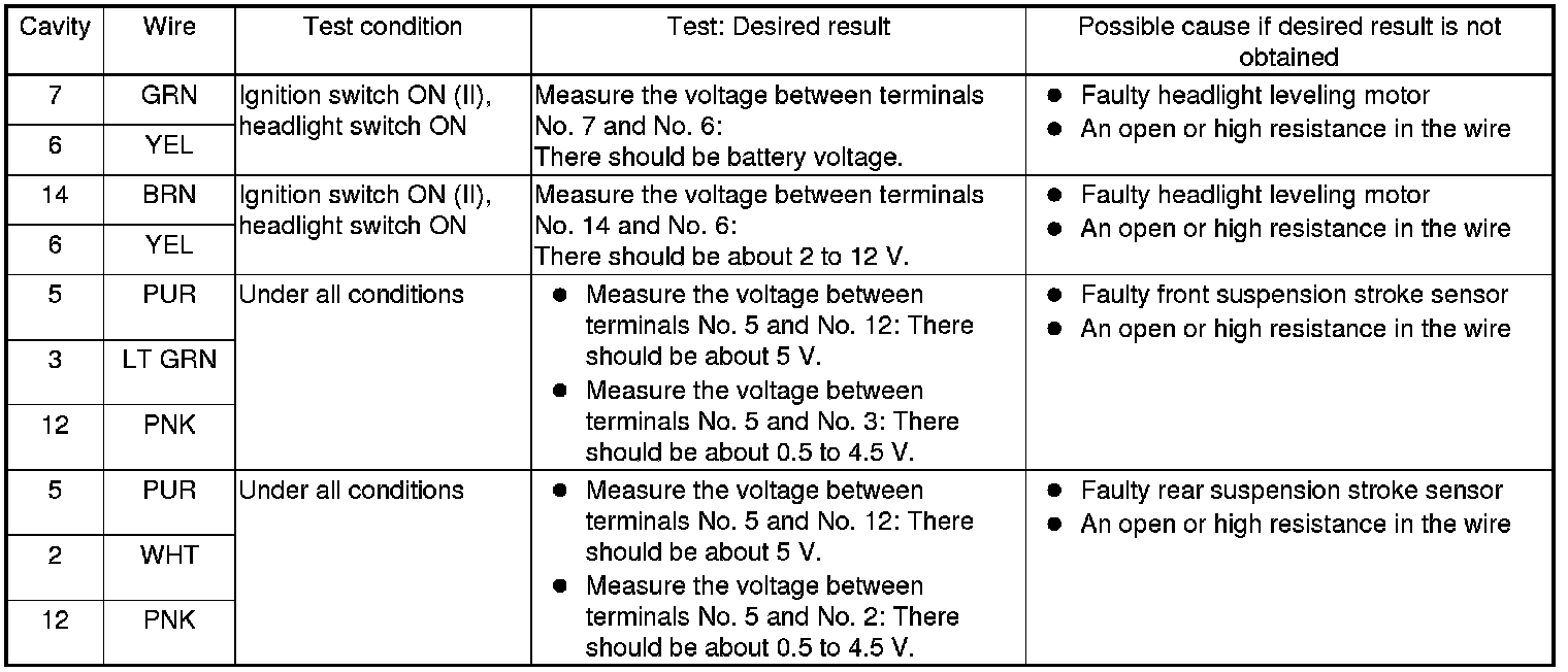 5. Reconnect the connector to the headlight leveling control unit, and do the following input tests: