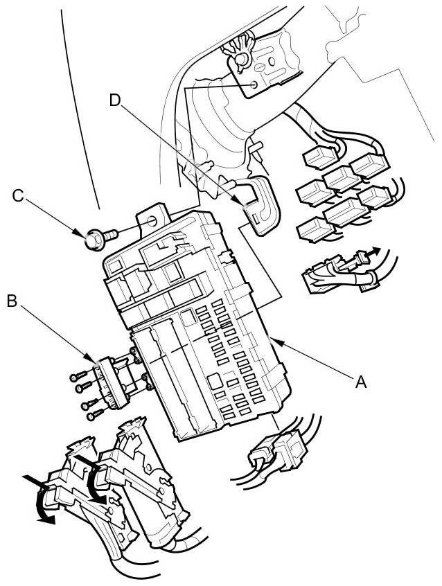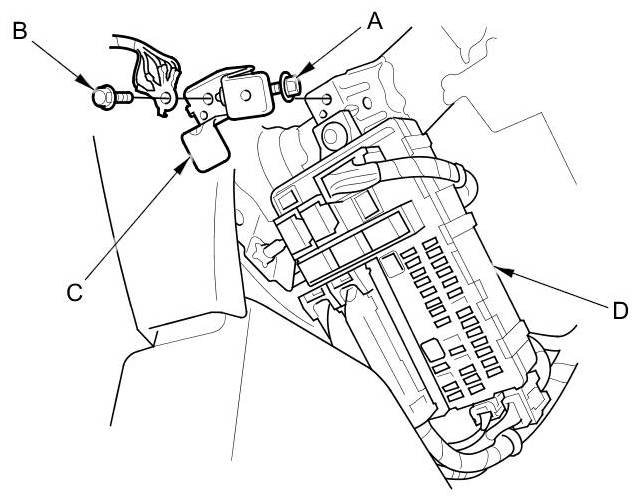 4. Remove the bracket from the driver's under-dash fuse/relay box (D).