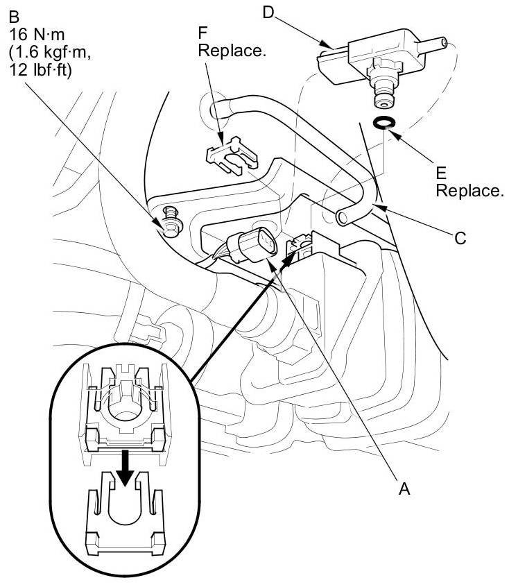 3. Disconnect the hose (C), and remove the FTP sensor (D).