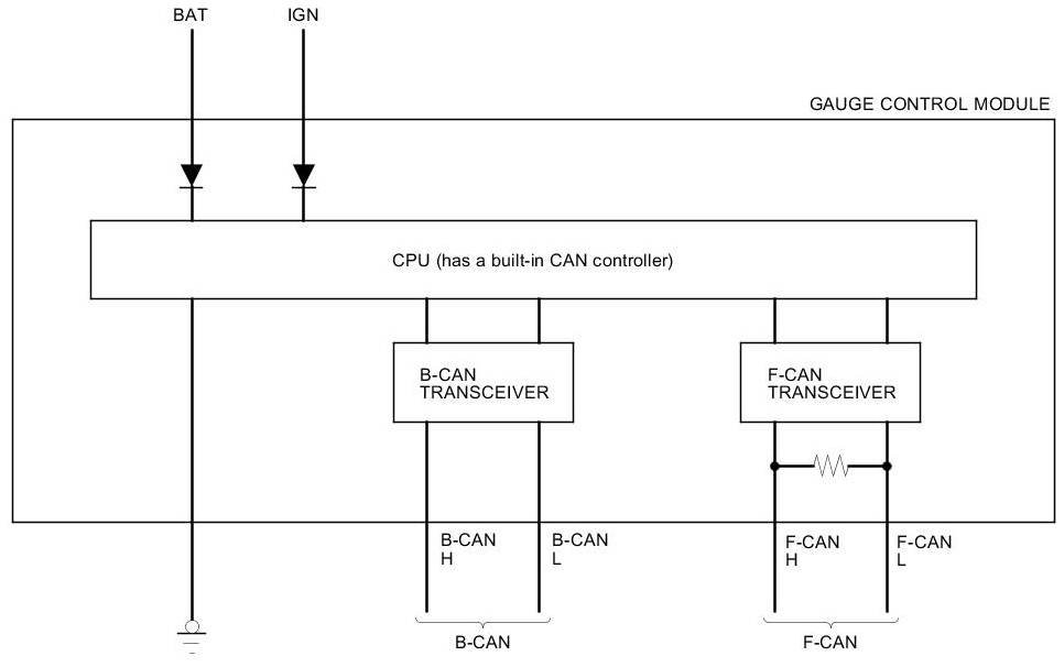 The gauge control module acts as a gateway to allow both systems to share information. The gauge control module translates and relays the information from B-CAN to F-CAN and from F-CAN to B-CAN.