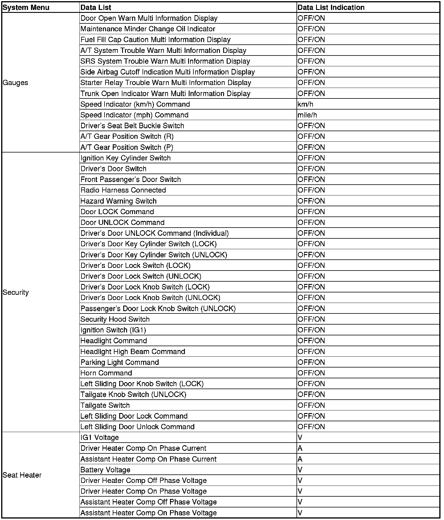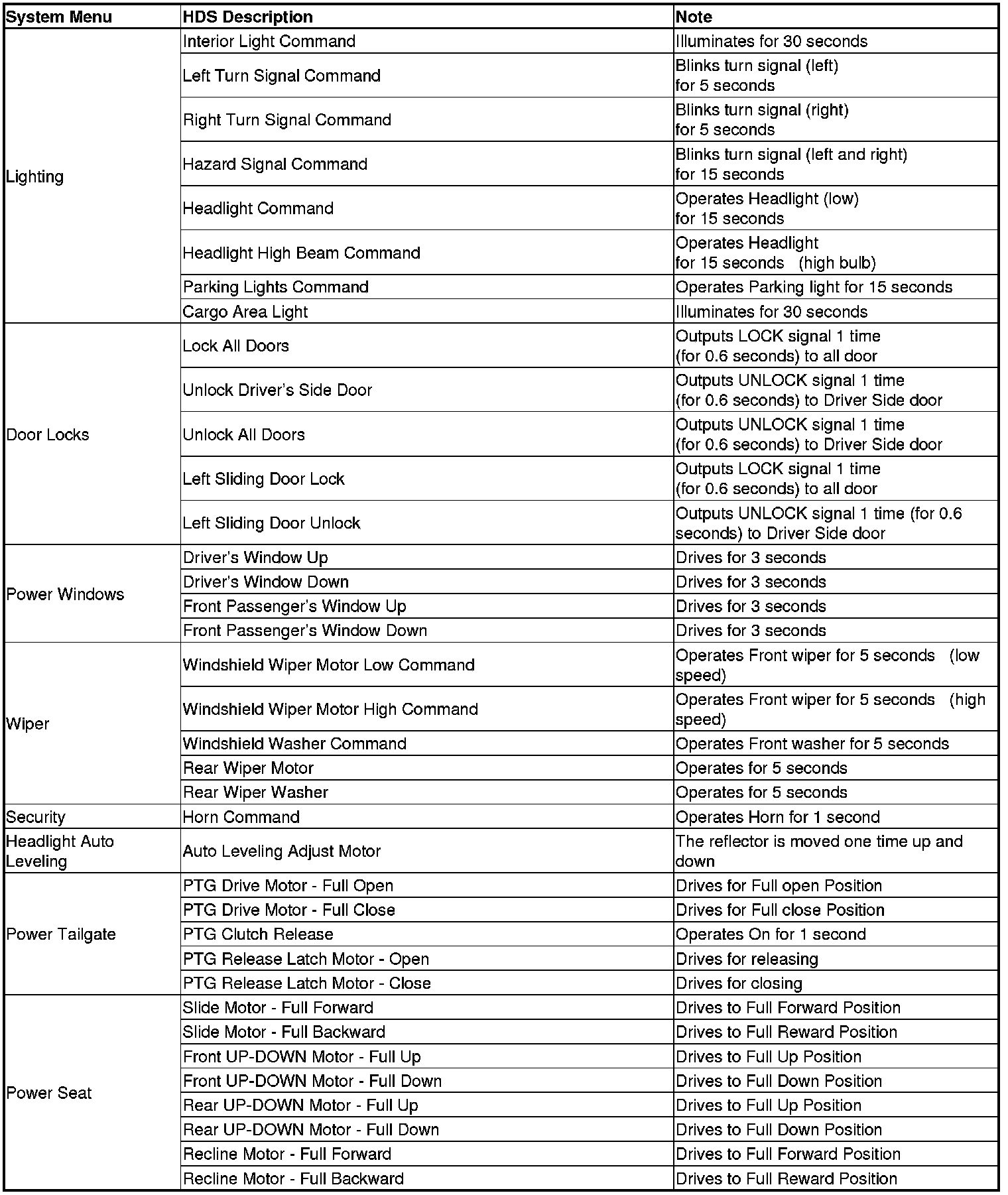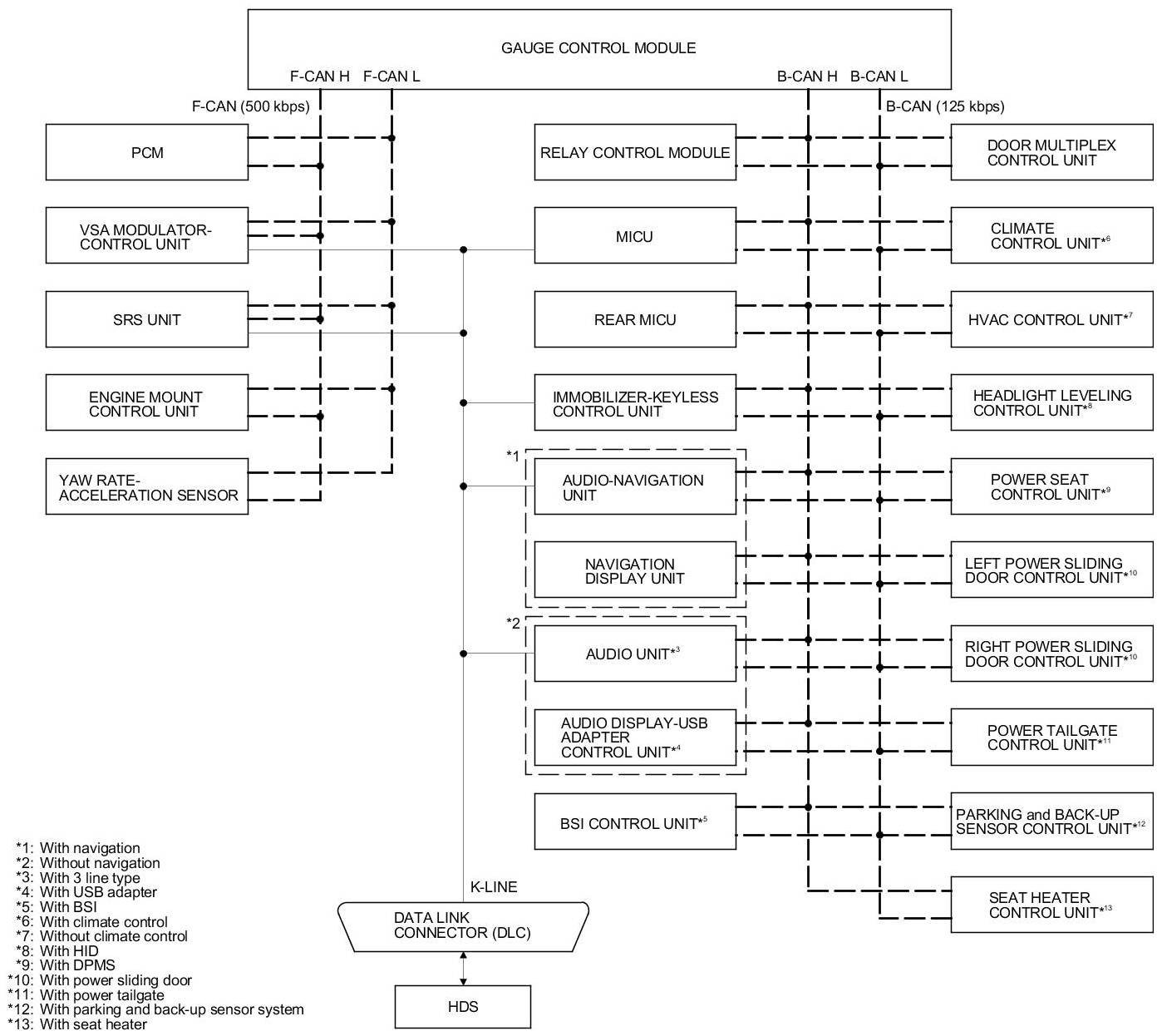 By connecting the HDS to the data link connector (DLC), the HDS can retrieve the diagnostic information from the MICU via a diagnostic line called the K-LINE. The K-LINE is a separate communication line from the CAN lines, and is connected to most of the CAN related ECUs. The MICU is a gateway between the HDS and B-CAN related ECUs, and sends B-CAN diagnostic information to the HDS. When doing a function test with the HDS, the HDS sends an output signal through the K-LINE to the MICU. The MICU either relays the request to another ECU, or commands the function itself.