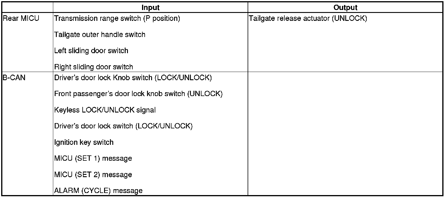 The rear MICU controls the tailgate release actuator based on inputs from each switch and B-CAN data.