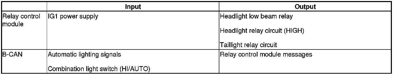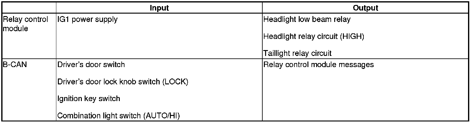 The relay control module controls automatic lighting based on inputs from the ignition switch (IG1) and B-CAN data.