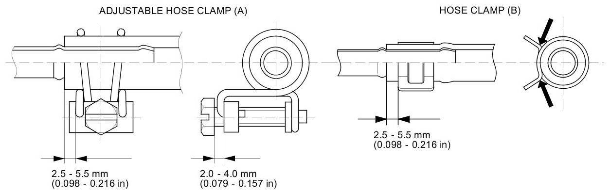 - Connect each hose to the corresponding line securely until it contacts the stop on the line. Install the clamp or adjustable clamp at the specified distance from the hose end as shown.