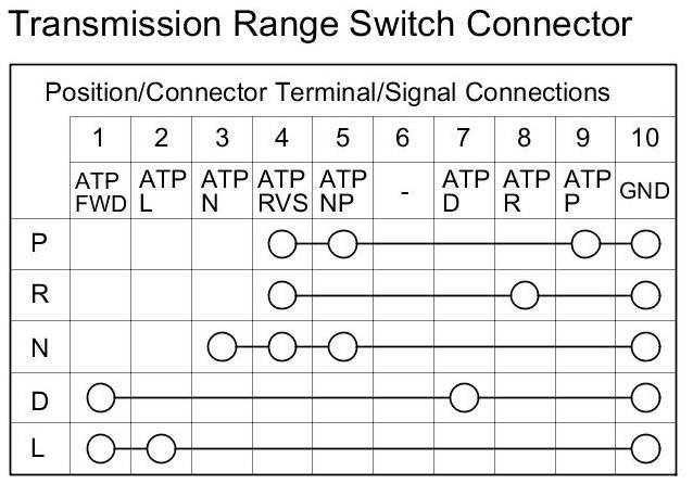 8. Check for continuity between terminals at the transmission range switch connector. There should be continuity between the terminals in the following table for each switch position.