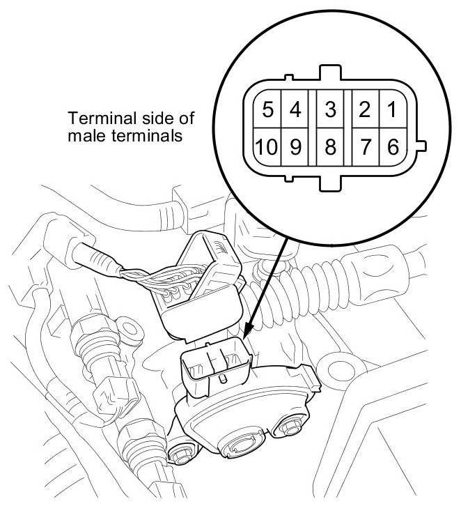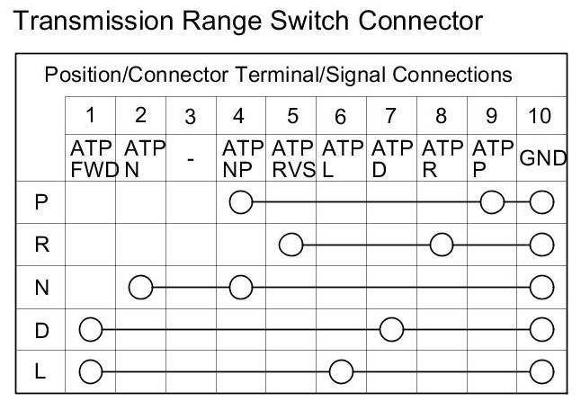 8. Check for continuity between the terminals at the transmission range switch connector. There should be continuity between the terminals in the following table for each transmission range switch position.