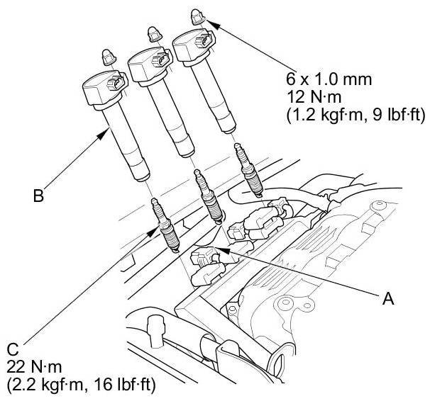 3. Remove the spark plugs (C) and inspect them Testing and Inspection.