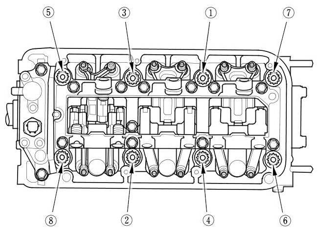Tighten each bolt two turns at a time in the sequence shown to ensure that the rockers do not bind on the valves.