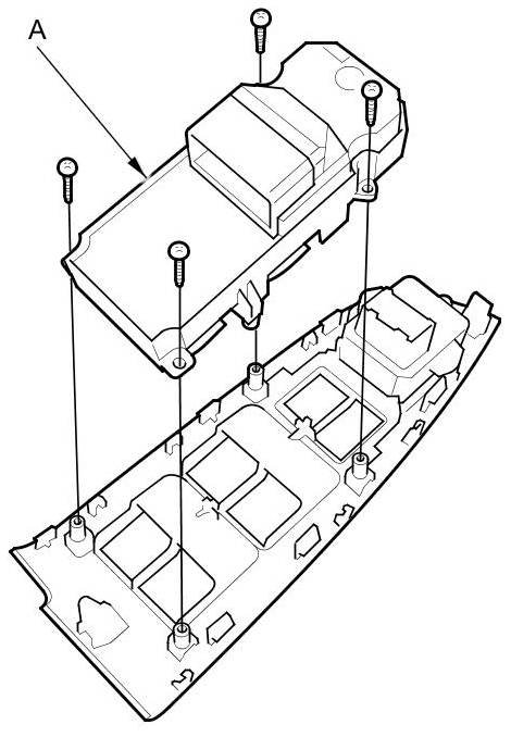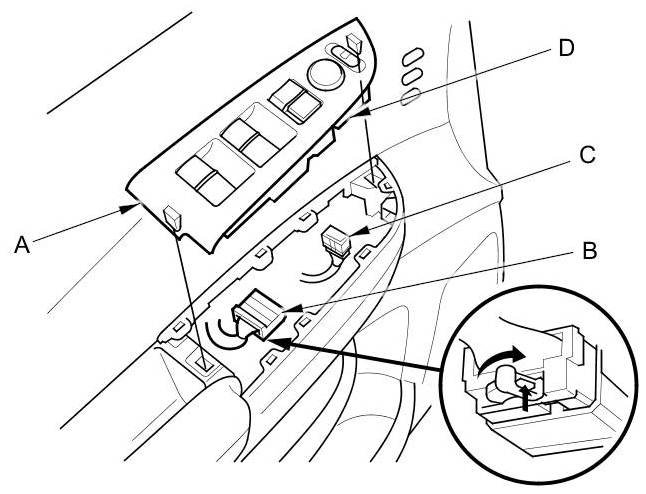 2. Disconnect the 37P connector (B) from the power window master switch, and the 13P connector (C) from the power mirror switch (D).