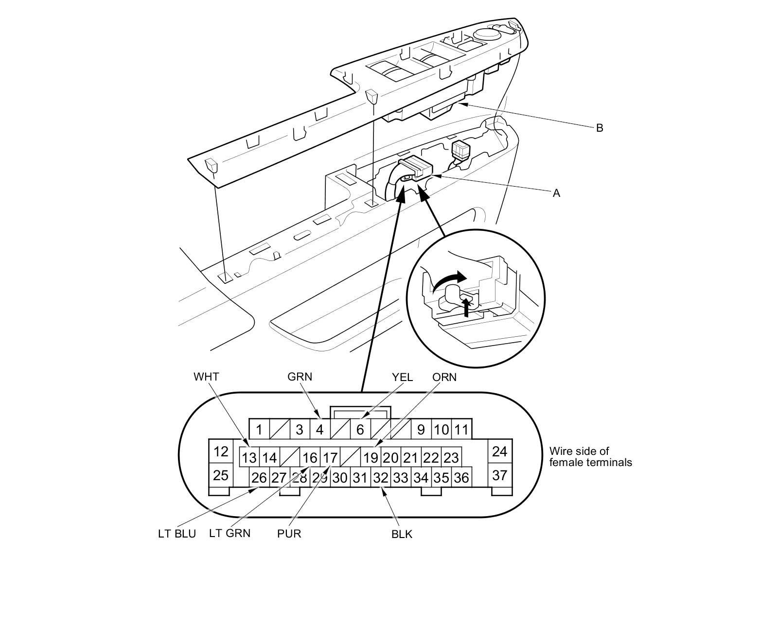 3. Disconnect the 37P connector (A) from the power window master switch (B).