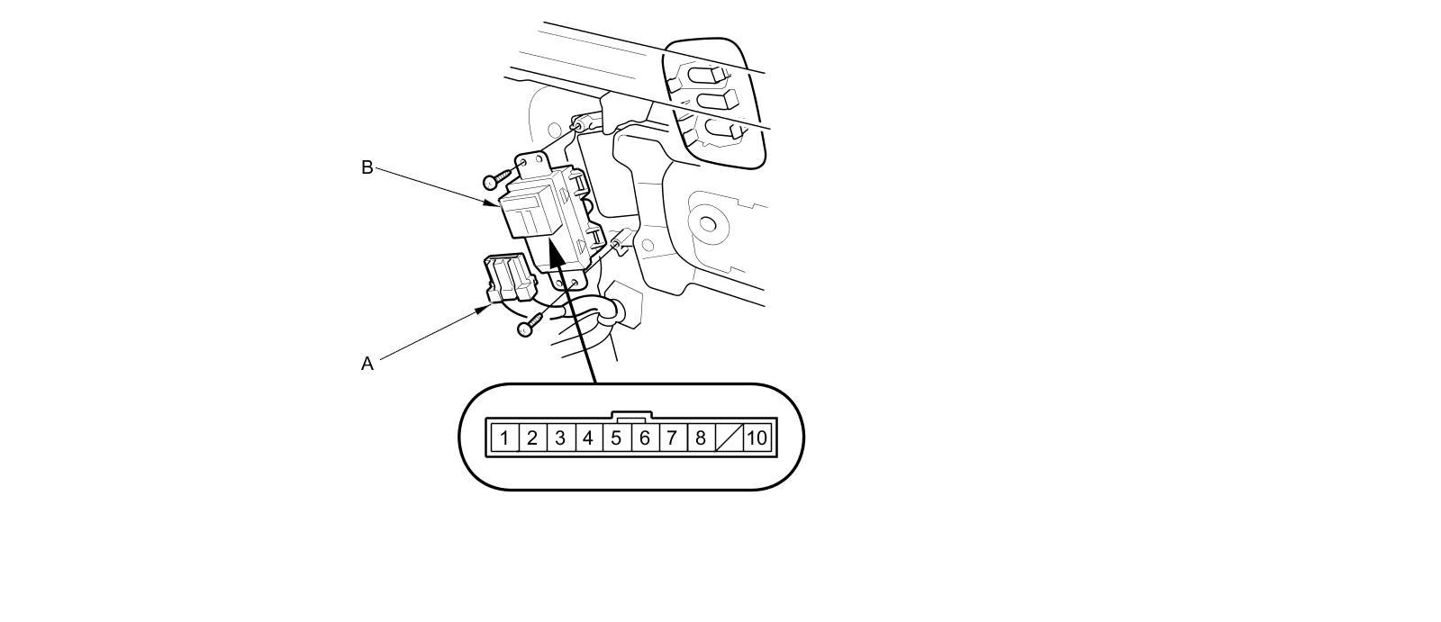 2. Disconnect the 10P connector (A) from the driving position memory switch (B).