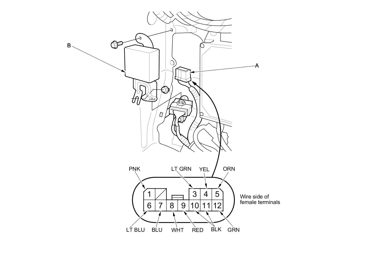 3. Disconnect the 12P connector (A) from the trailer lighting control unit (B).