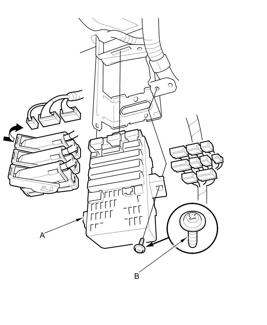 4. Remove the mounting one-way screw (B), and pull the under-dash fuse/relay box away from the body.