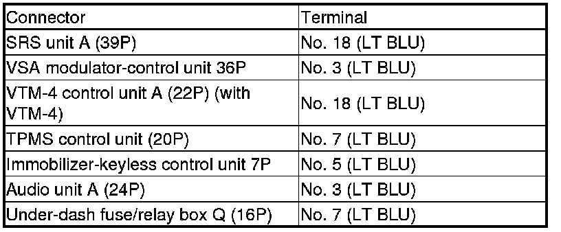 22. Check for continuity between body ground and the following connector terminals, with all listed control units disconnected.