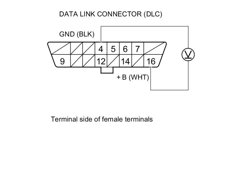 26. Measure the voltage between DLC terminal No. 16 and body ground.