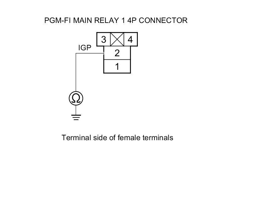 48. Check for continuity between PGM-FI main relay 2 (FUEL PUMP) 4P connector terminal No. 1 and body ground.