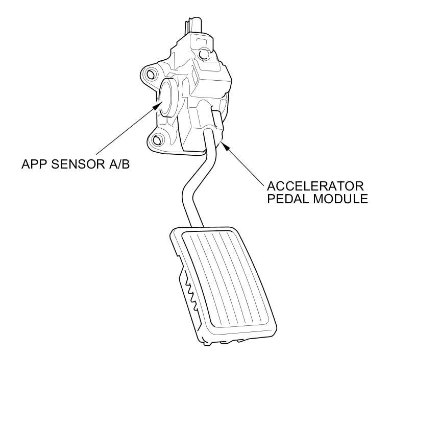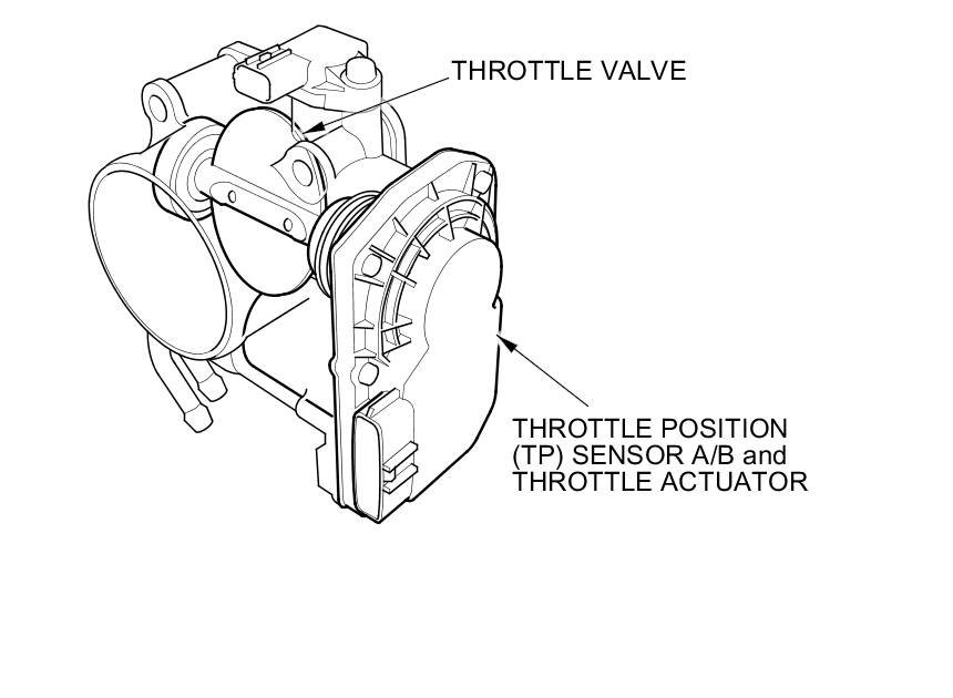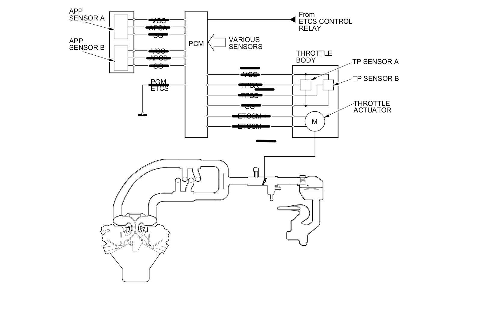 The electronic throttle control system consists of the throttle actuator, throttle position (TP) sensor A/B, accelerator pedal position (APP) sensor A/B, the electronic throttle control system (ETCS) control relay, and the PCM.