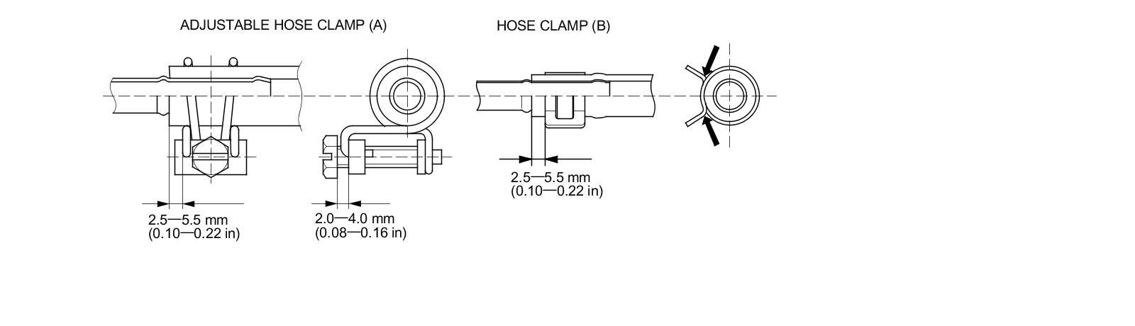 - Connect each hose to the corresponding line securely until it contacts the stop on the line. Install the clamp or adjustable clamp at the specified distance from the hose end as shown.