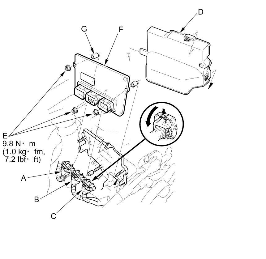 14. Remove the nuts (E), and remove the PCM (F).