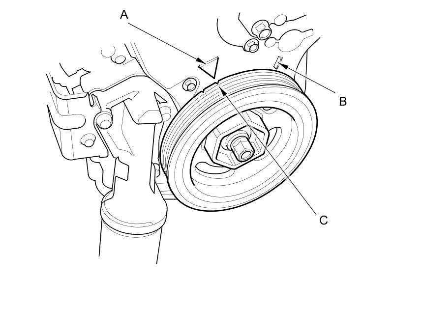 9. Aim the light toward the pointer (A) on the timing belt lower cover. Check the ignition timing under a no load condition (headlights, blower fan, rear window defogger, and air conditioner are turned off).