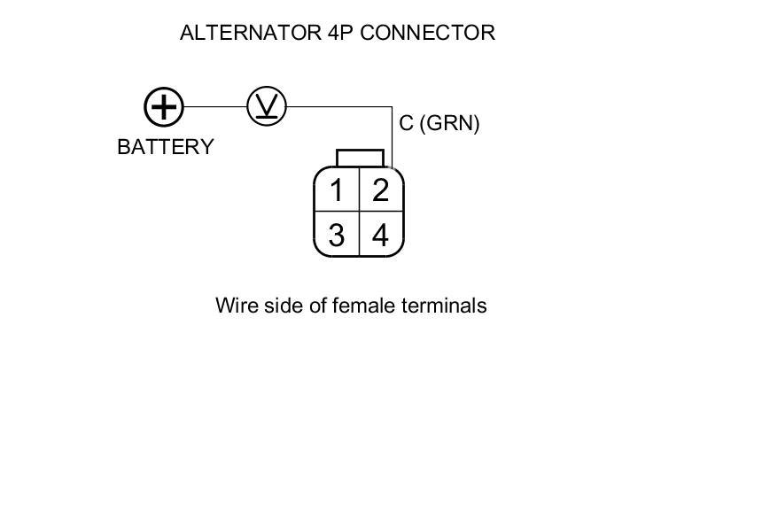 7. Measure the voltage between alternator 4P connector terminal No. 2 and the positive terminal of the battery.