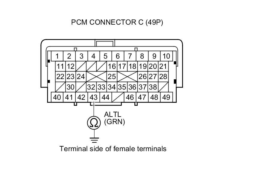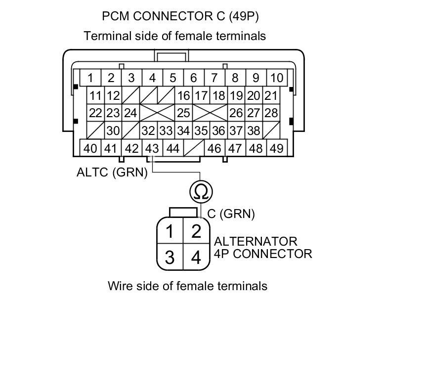 13. Check for loose terminals and connections, then check for continuity between PCM connector terminal C43 and alternator 4P connector terminal No. 2.