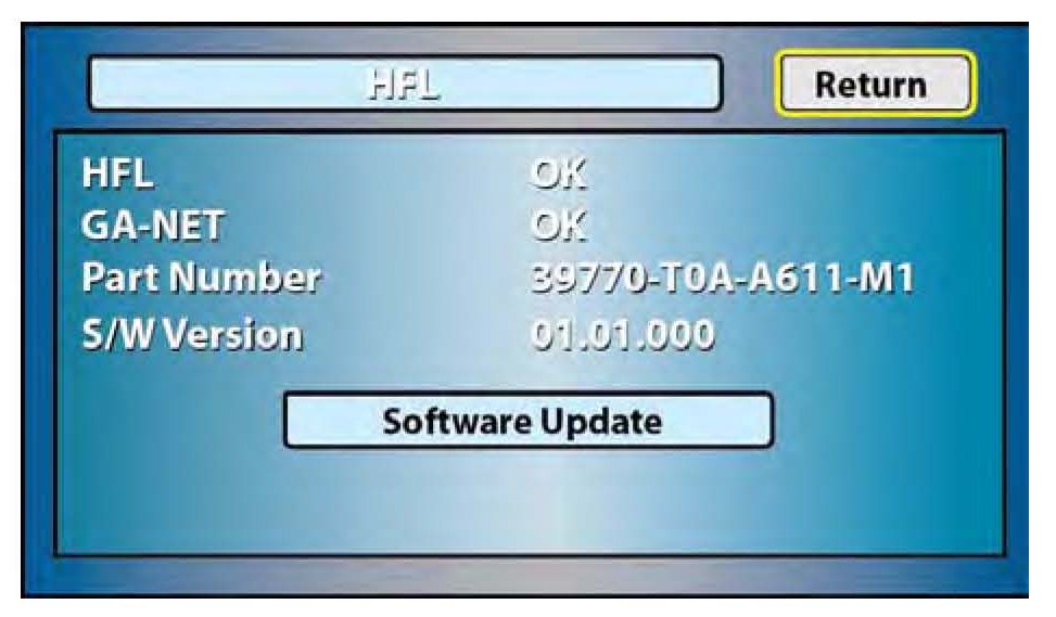 6. Confirm the HFL software version: the HFL software update shown on the navigation screen may not show the same results as the HDS laptop. Turn the ignition OFF and wait 10 seconds before going to step 7.