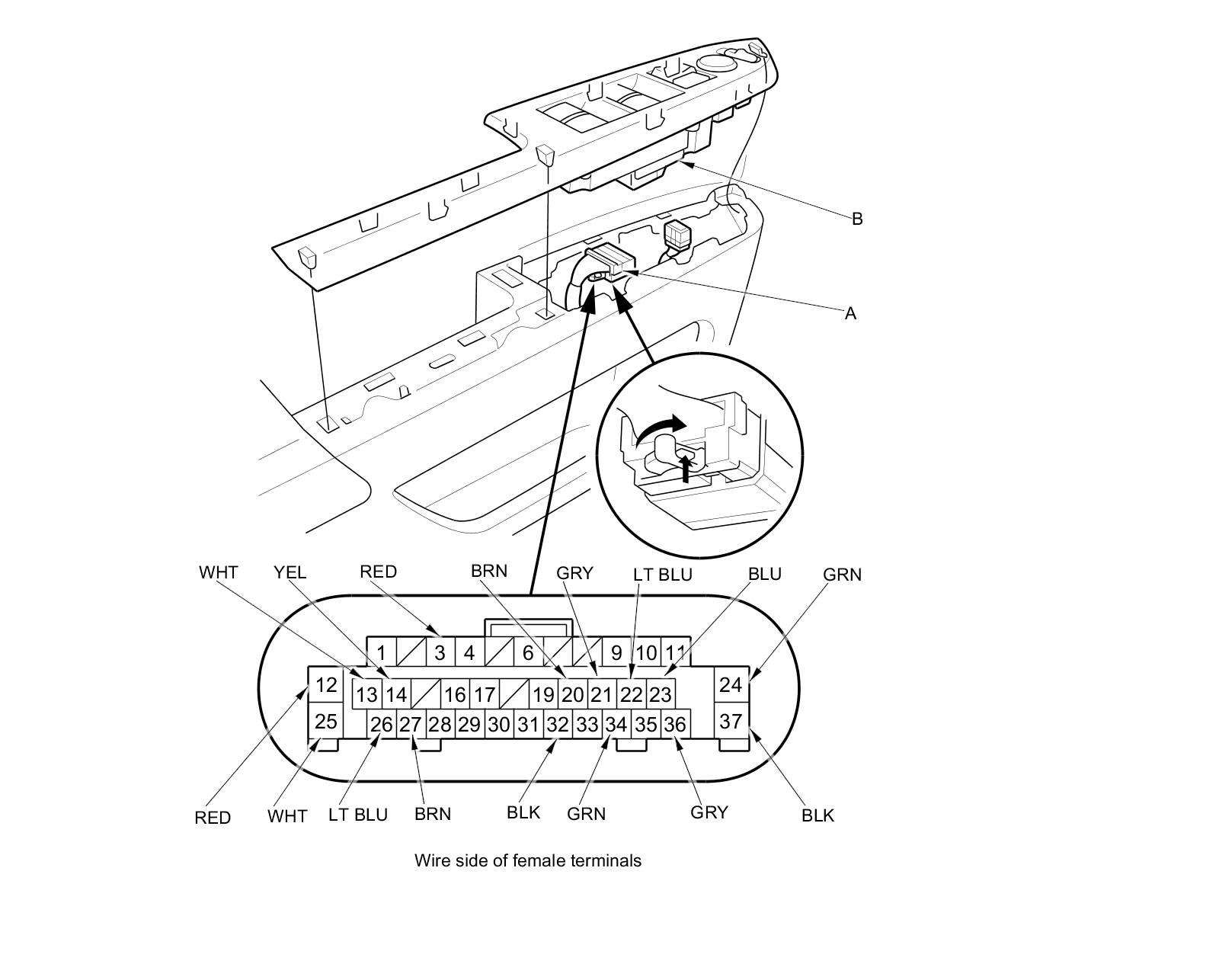 2. Disconnect the 37P connector (A) from the power window master switch (B).