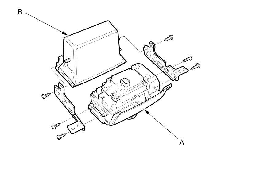4. Remove the screws and brackets, then separate the navigation switch panel (A) and the center pocket (B).