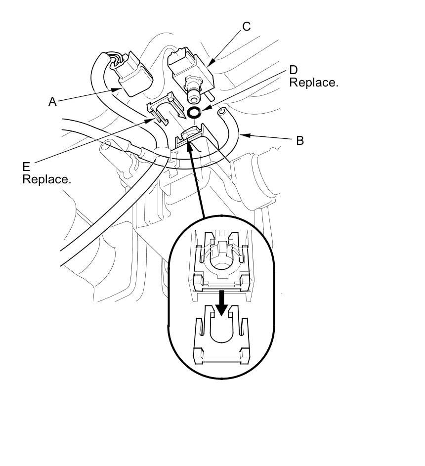 5. Install the parts in the reverse order of removal with a new O-ring (D) and a new retainer (E).