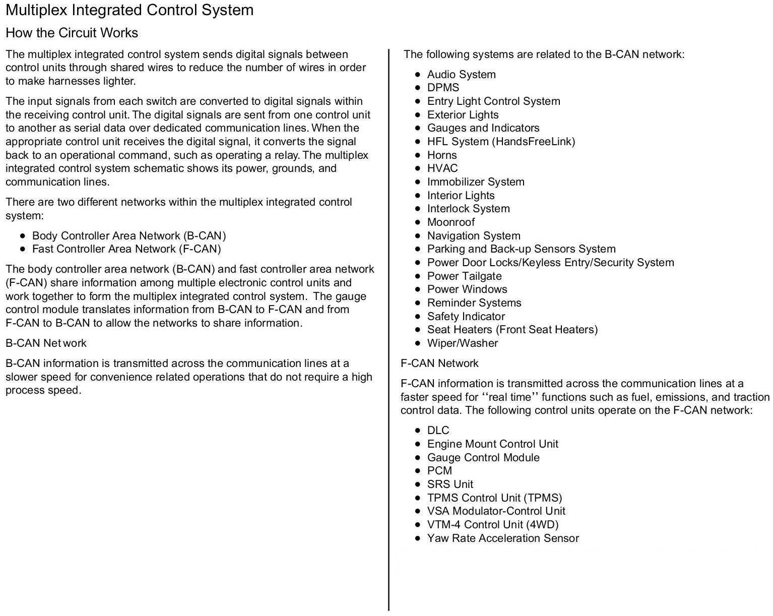 Home >> Honda >> 2012 >> Pilot 4WD V6-3.5L >> Repair and Diagnosis >> Powertrain Management >> Computers and Control Systems >> Information Bus >> Description and Operation >> How The Multiplex Integrated Control System Circuit Works