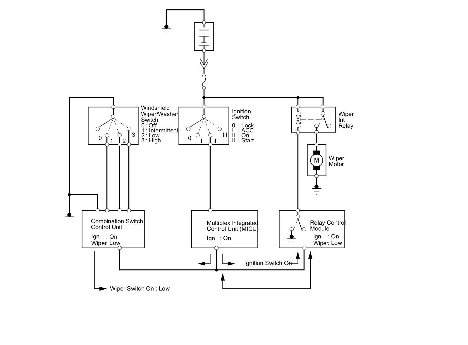 - The multiplex integrated control unit (MICU), relay control module, and gauge control module expect to receive the door lock switch message, but since there is a break in the communication circuits, it is not received.
