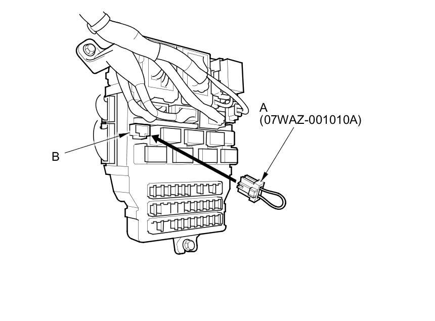 4. Connect the MPCS (MCIC) service connector (A) to the multiplex control inspection connector socket (B) in the under-dash fuse/relay box.