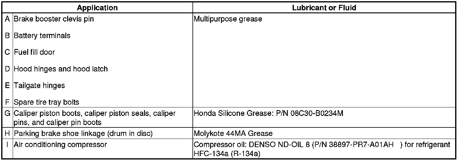 - Lubricate the following areas using the recommended lubricants and fluids.
