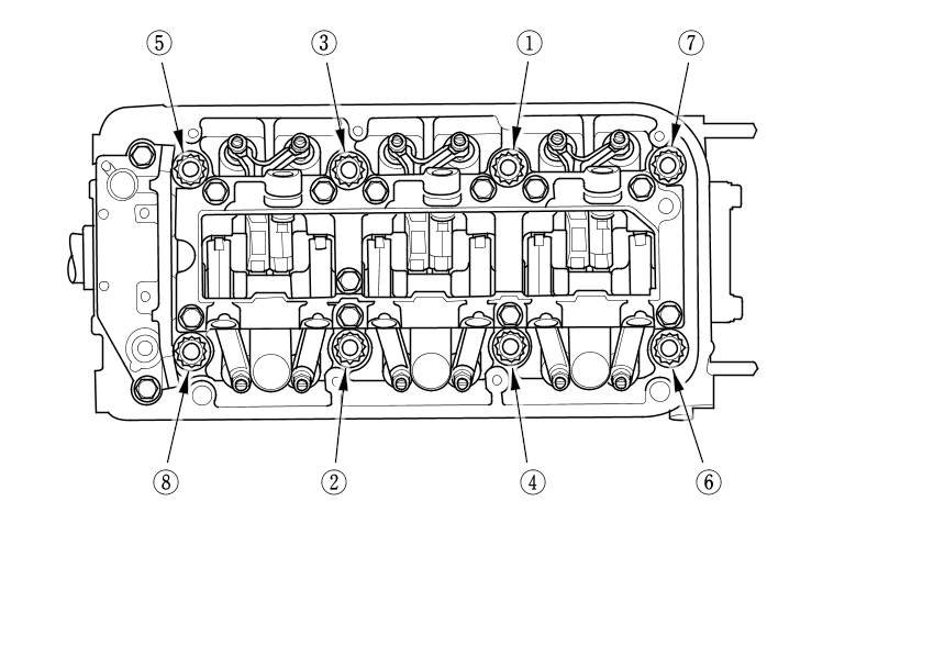 Tighten each bolt two turns at a time in the sequence shown to ensure that the rockers do not bind on the valves.