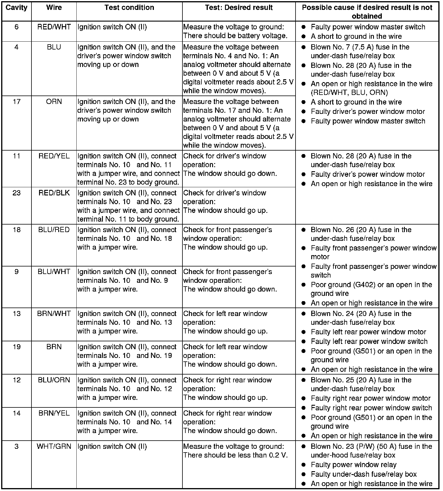 - If all the input tests prove OK, the control unit must be faulty; replace the power window master switch Power Window Master Switch Replacement, and go to step 8.
