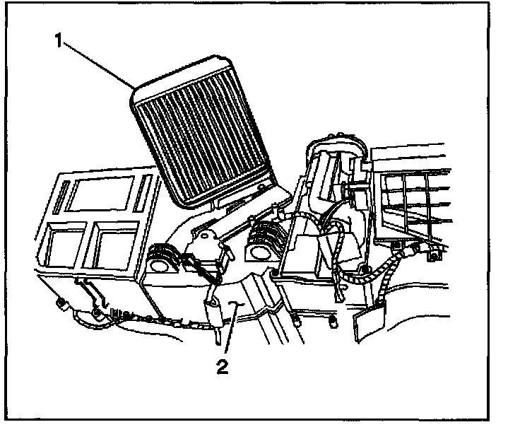 1. Install the heater core (1) to the HVAC module assembly (2).
