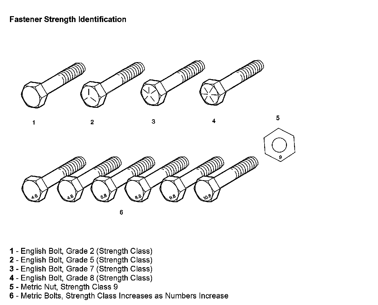 The most commonly used metric fastener strength property classes are 9.8 and 10.9. The class identification is embossed on the head of each bolt. The English, inch strength classes range from grade 2 to grade 8. Radial lines are embossed on the head of each bolt in order to identify the strength class. The number of lines on the head of the bolt is 2 lines less than the actual grade. For example, a grade 8 bolt will have 6 radial lines on the bolt head. Some metric nuts are marked with a single digit strength identification number on the nut face.