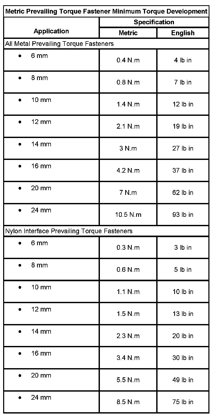 Metric Prevailing Torque Fastener Minimum Torque Development: