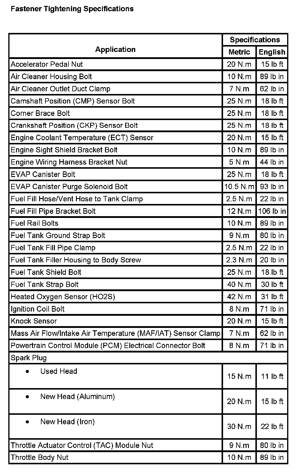 Fastener Tightening Specifications: