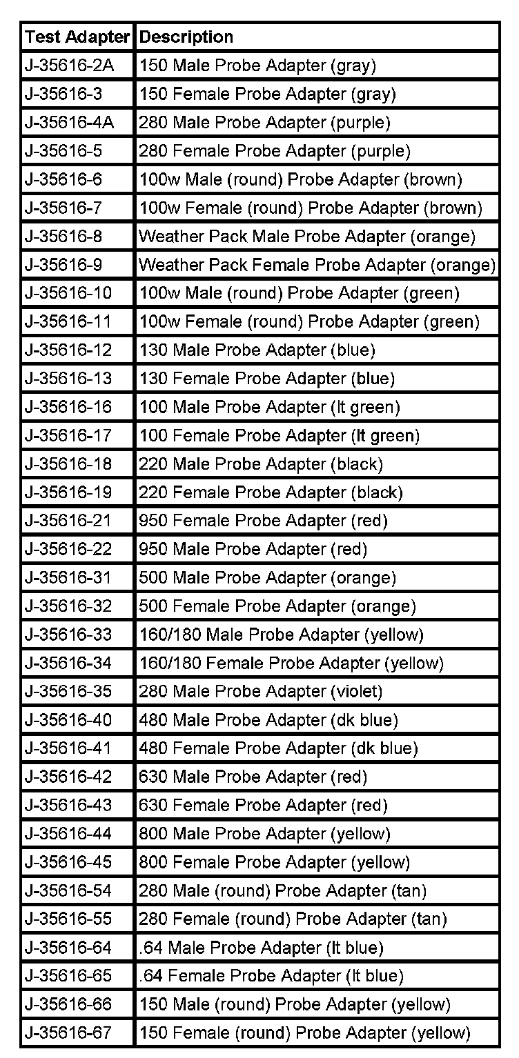 NOTE: Do not insert test equipment probes (DVOM etc.) into any connector or fuse block terminal. The diameter of the test probes will deform most terminals. A deformed terminal will cause a poor connection, which will result in a system failure. Always use the J-35616 GM-Approved Terminal Test Kit or the J 42675 Flat-Wire Probe Adapter in order to front probe terminals. Do not use paper clips or other substitutes to probe terminals.