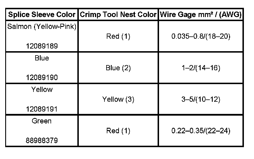 4. Select the proper duraseal splice sleeve according to the wire size. Refer to the above table at the beginning of the repair procedure for the color coding of the duraseal splice sleeves and the crimp tool nests.