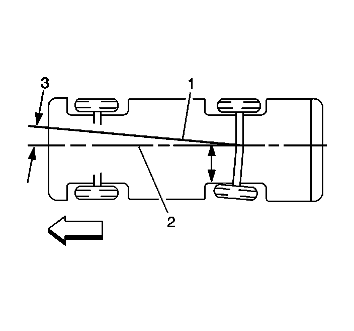 In the illustration, toe-in is shown on the left rear wheel, moving the thrust line (1) off center. The resulting deviation from the centerline is the thrust angle.