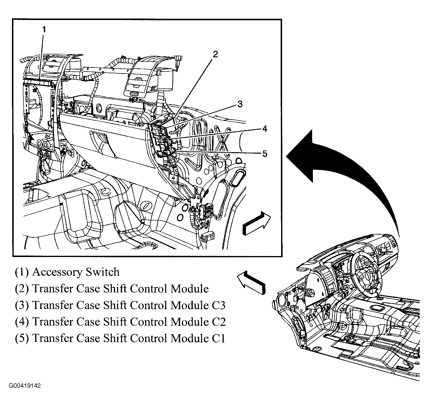Transfer Case Shift Control Module Behind glove box. See Figure.