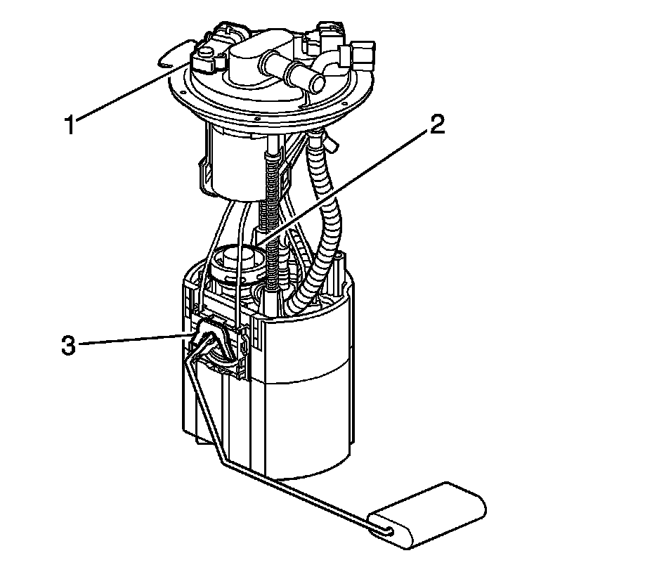The fuel pressure regulator (2) is contained in the fuel sender assembly. The fuel pressure regulator is a diaphragm relief valve. The diaphragm has fuel pressure on one side and regulator spring pressure on the other side. The fuel pressure regulator is not vacuum biased. Fuel pressure is controlled by a pressure balance across the regulator. The fuel system pressure is constant.