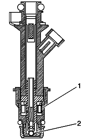 The fuel injector assembly is a solenoid device controlled by the control module that meters pressurized fuel to a single engine cylinder. The control module energizes the high-impedance, 12 ohms, injector solenoid (1) to open a normally closed ball valve (2). This allows fuel to flow into the top of the injector, past the ball valve, and through a director plate at the injector outlet. The director plate has four machined holes that control the fuel flow, generating a spray of finely atomized fuel at the injector tip. Fuel from the injector tip is directed at the intake valve, causing the fuel to become further atomized and vaporized before entering the combustion chamber. This fine atomization improves fuel economy and emissions.