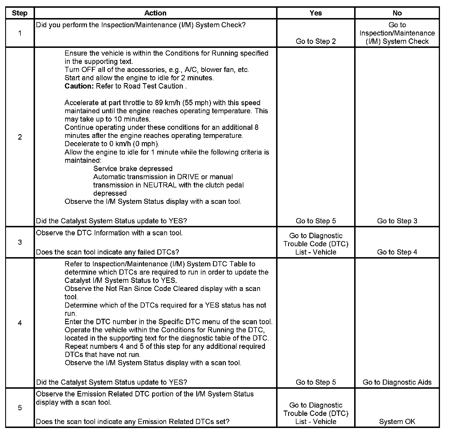 The purpose of this procedure is to satisfy the enable criteria necessary to execute an inspection/maintenance (I/M) system monitor for the catalyst system. The system monitor is comprised of the test results from one or more DTCs. This procedure may be used to set the Catalyst I/M System Status display on the scan tool to YES. The Catalyst I/M System Status display indicates whether or not the control module has completed the system monitor. The system monitor completes when either all DTCs comprising the monitor run and pass, or any DTC comprising the monitor illuminates the malfunction indicator lamp (MIL). If one of the DTCs comprising the monitor is set and the MIL is not illuminated, the necessary trips are required to illuminate the MIL before the monitor will complete. Once the monitor completes, the Catalyst I/M System Status display will be updated to YES.