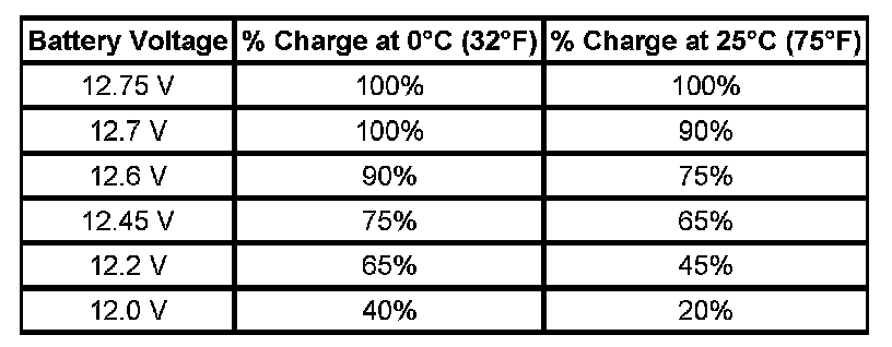 Important: Using voltage to determine the batteries state of charge (SOC) is only accurate after the battery has been at rest for 24 hours. This is enough time for the acid in each cell to equalize. If the battery has been charged or discharged in the past 24 hours, the battery SOC will only be an estimate.