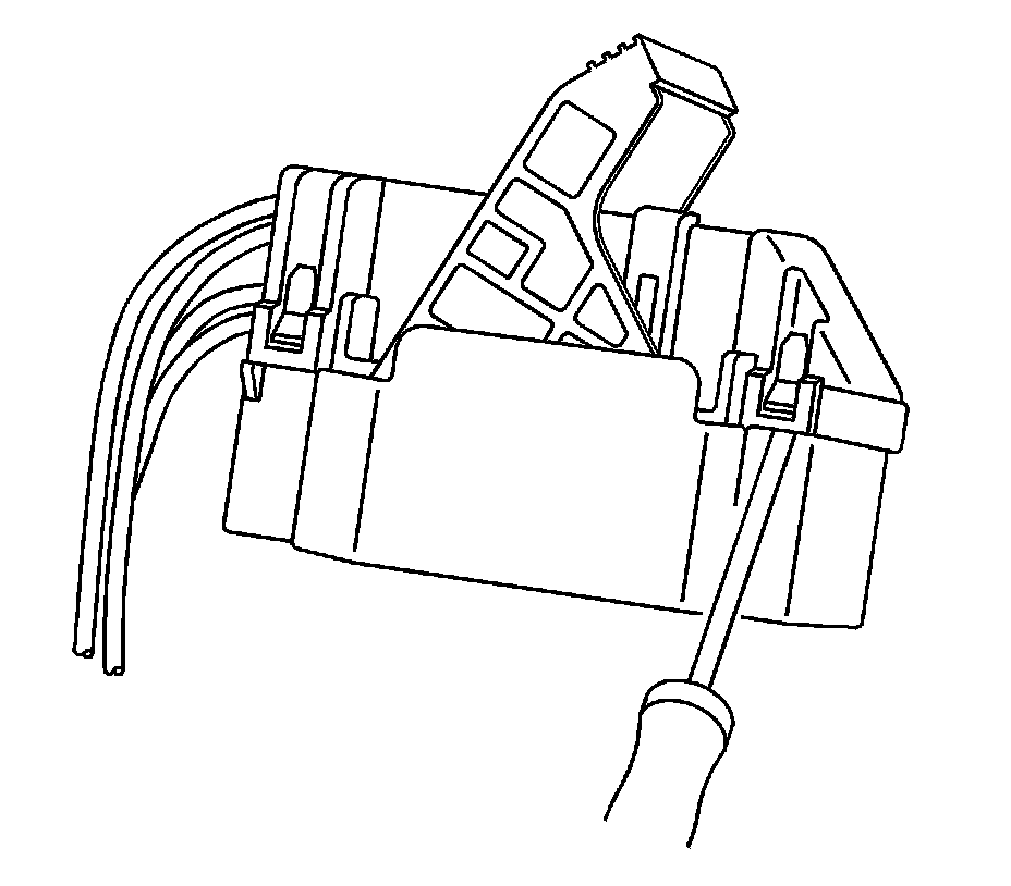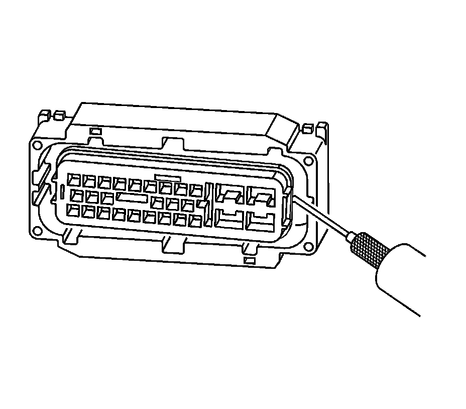 8. Insert the J-38125-553 (15315247) tool into the entry canal and pry up on the terminal retainer. The terminal retainer is a small plastic piece on the top of the terminal. The terminal retainer must be held up while the terminal is pulled out of the connector.