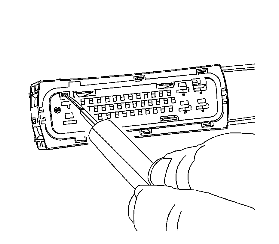 6. For the larger terminals insert the J 38125-13A (GM P/N 12031876-1) tool to release the terminals by inserting the tool into the terminal release cavity. For the smaller terminals insert the J 38125-12A (GM P/N 12094429) tool to release the terminals by inserting the tool into the terminal release cavity. See the release tool cross reference in the Reference Guide of the J-38125 to ensure that the correct release tool is used.